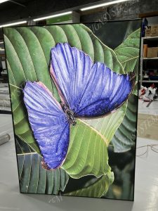 Мы устанавливаем LED-ленты последнего поколения мощностью 14-18 Вт на погонный метр. Светодиоды располагаются равномерно по периметру каркаса, создавая мягкое рассеянное свечение без «провалов» и ярких пятен. Ткань работает как диффузор (рассеиватель света), поэтому изображение светится ровно по всей площади. Энергопотребление в 3 раза ниже неоновых ламп, а срок службы LED — до 50 000 часов работы.