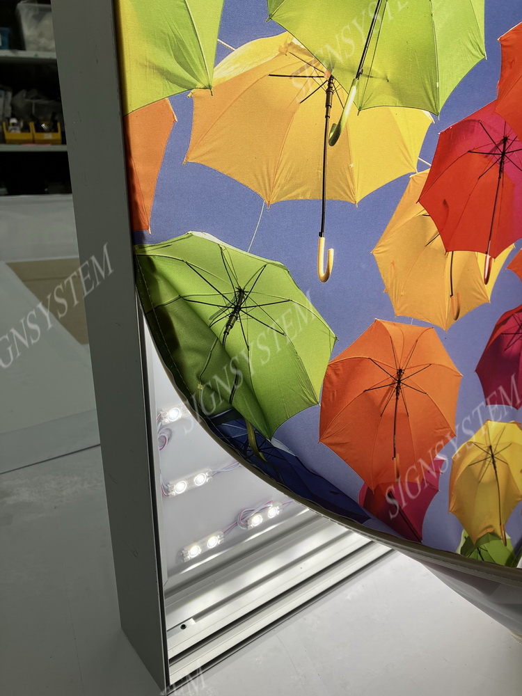Профиль для текстильного лайтбокса — алюминиевый с клипсой для бескаркасного монтажа, ткань — сатен (гладкий, негорючий материал с идеальной светопроницаемостью). Световая панель текстильная на сатене дает равномерный свет. Мы подберем под ваш текстильный лайтбокс на